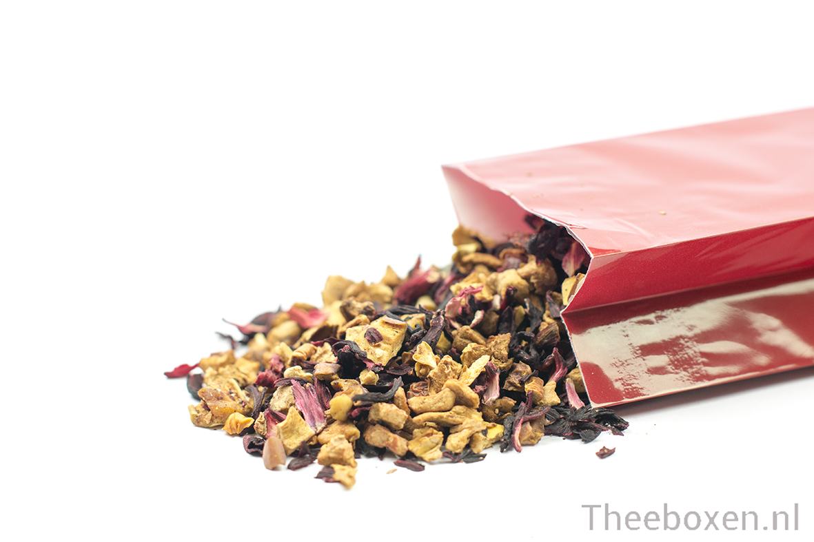 Appelstukjes, hibiscus, cranberry’s (veenbessen, suiker, zonnebloemolie) (20%), aroma.