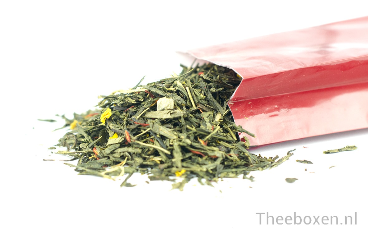 Ingrediënten: Groene thee (89%), ananas blokjes (suiker, ananas, voedingszuur: citroenzuur), mango korrels (glucosestroop , mango puree concentraat, verdikkingsmiddel, zonnebloem bloesems .