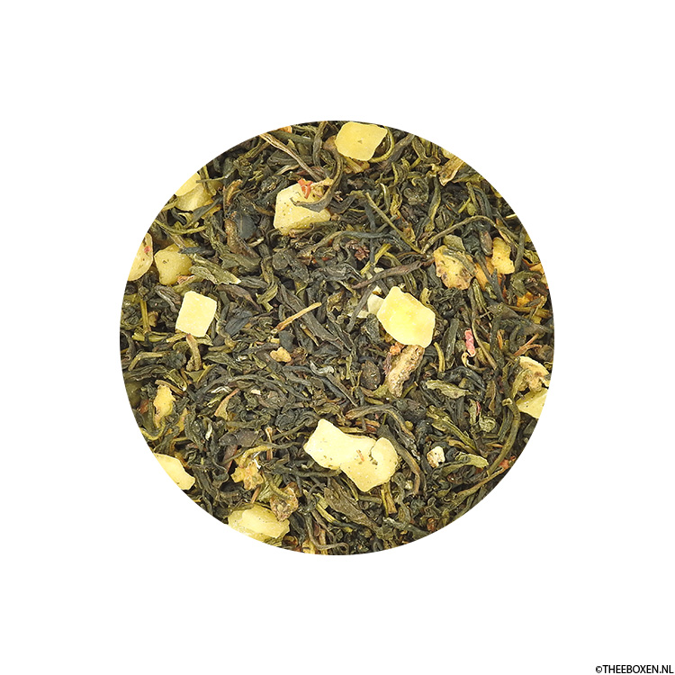 Een frisse, zomerse groene thee met zachte mangosmaak en een romige lassi‑touch (Indiase yoghurtdrank). De combinatie van groene thee, mango, yoghurt en een vleugje citrus zorgt voor een lichte, tropische en verfrissende melange.